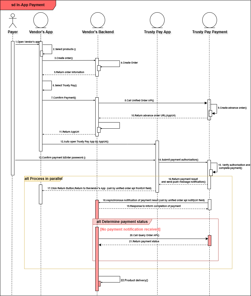 In-App Payment means that the Trusty Pay user selects goods and places orders in the merchant's App, and selects Trusty Pay at the payment stage. Then the Trusty Pay client will be pulled up from the merchant's App, and the system will automatically redirect back to the merchant's App after the user completes the payment in the Trusty Pay client.