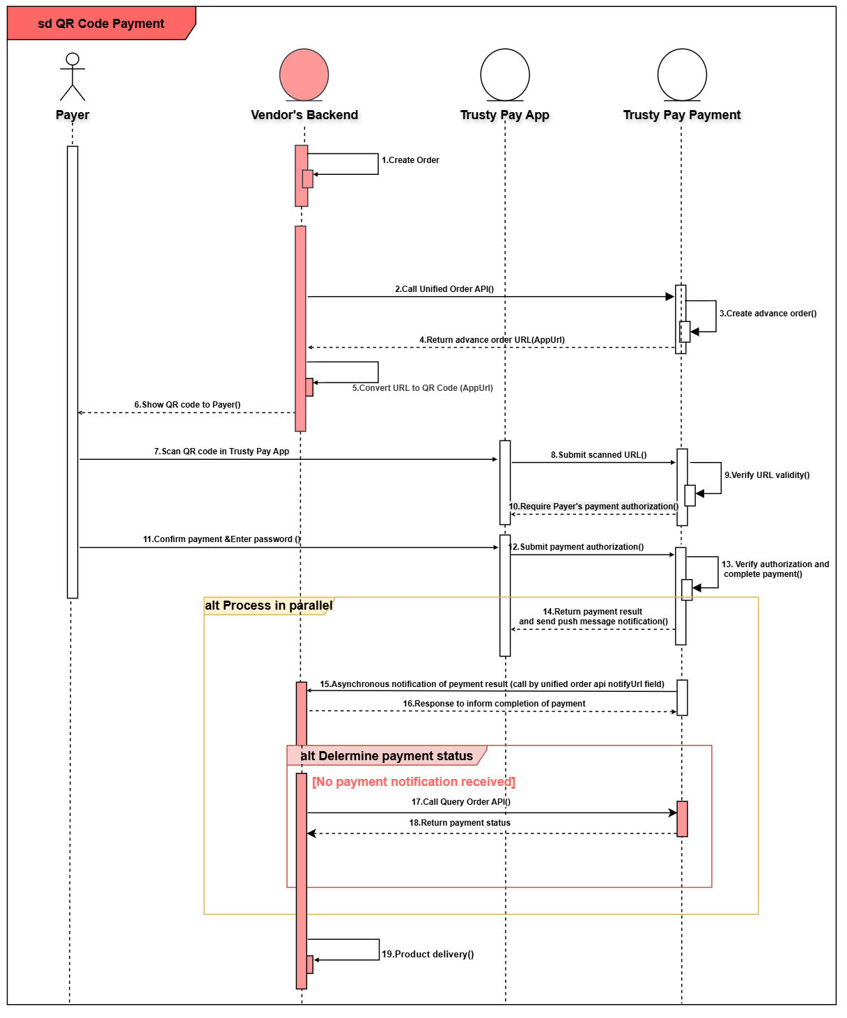 The Merchant's backend calls the 【Unified Order】 and the Trusty payment system returns appUrl to the Merchant's backend to create a QR Code. The Payer scans the QR Code in Trusty Pay App to initiate payment.